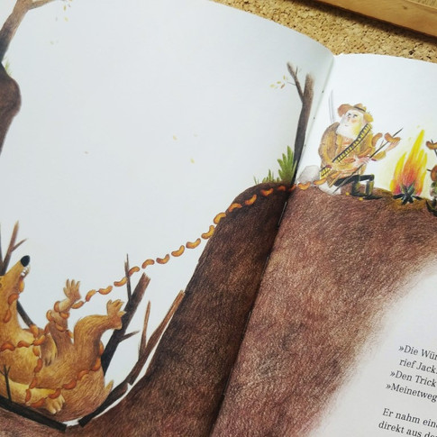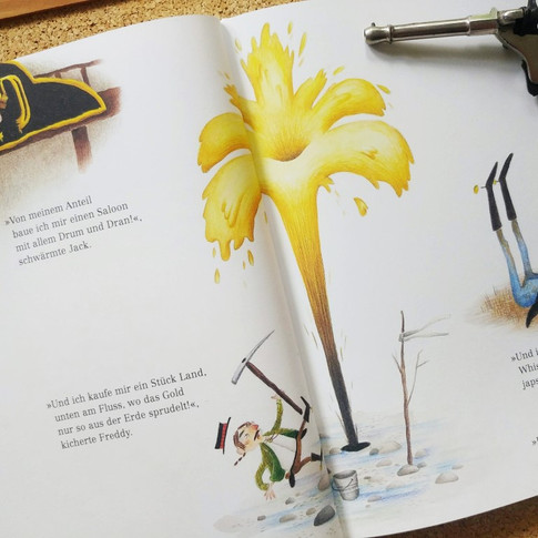 Ein weiteres Highlight sind neben der klug erzählten/gezeichneten Geschichte die Illustrationen. Äusserst detailreich nimmt uns Lotte Bräuning mit ihren Buntstiftzeichnungen auf Aquarell mit in den Wilden Westen, in den Saloon, ja bis ins Bärenfell, das aufs Haar genau zu erkennen ist. Kein Wunder, war sie mit ihrem Debüt bereits für die Serafina 2019, den Illustrationspreis für Nachwuchstalente, nominiert!