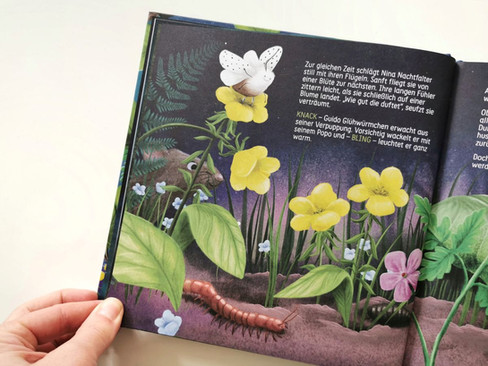 Im neusten Sachbilderbuch von Alina Gries und Alina Spiekermann erleben wir mit "Finn Fledermaus" ganz unmittelbar, was die Lichtverschmutzung bedeutet. Eigentlich macht sich Finn gerade auf zu seinem ersten Nachtflug, da geht plötzlich ein gleissend helles Licht an. Das blendet nicht nur Finn, sondern auch Nina Nachtfalter, Guido Glühwürmchen und ganz viele weitere nachtaktive Tiere, die am Abend den Wald zum Leben erwecken.
