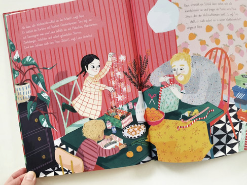 Laura Rosendorfer (ihr erinnert euch vielleicht an ihre Illustrationen in "Frida und die fliegenden Zimtschnecken") hat die Geschichte für Kinder ab etwa 4 Jahren wunderbar illustriert. die Farbpallette mit viel Rot/Rosa und Grün/Mint passt wunderbar in die Weihnachtszeit und verströmt für mich skandinavisches Flair. Die Hauttöne, Haarfarben und -strukturen der abgebildeten Menschen variieren und während Luna ein Kleid trägt, ist Toni für meine Begriffe genderneutral unterwegs.