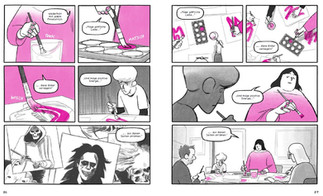 Die Zeichnungen sind abgesehen von der pinken Knallfarbe ganz in Grautönen gehalten. Ich weiss nicht, ob hinter der Farbwahl mehr steckt, aber ich finde sie als gestalterisches Motiv sehr gut gelungen. Es erinnert an etwas, das die ganze Zeit da ist, aber nicht immer aktiv wahrgenommen wird, und auch nicht unbedingt als gut oder schlecht eingeordnet werden kann. Denn das Pink kommt zunächst als positive Energie daher, sei es nun bei Thea und den energetisch aufgeladenen Steinen oder in Bezug auf Franks Verliebtheit. "Voir la vie en rose" hat hier eindeutig zwei sehr unterschiedliche Seiten.
