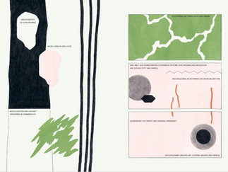 Hanna Harms zeichnet ihren Comic sehr grafisch, reduziert, mit beschränkter Farbpallette in Grün- und Rottönen. Sehr gut gefällt mir das Spiel mit Kontrasten - ob nun mit Hell und Dunkel oder mit farblichen Akzenten. Auch geometrische Formen und wildere Strukturen konstrastieren gut. Die Sprache ist ebenso reduziert wie die gestalterische Umsetzung. Der Text ist oft nicht in ganzen Sätzen, sondern eher stichwortartig verfasst und erhält gerade dadurch eine gewisse Poesie.